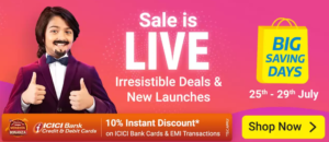Big Saving Days sale is Live from 25 July, 2021 and will run till 29 July 2021. The sale is offering discounts on several popular electronics and smartphones. Flipkart is offering a 10 percent discount on different bank cards.