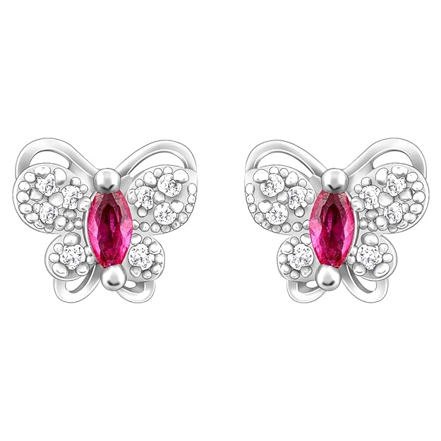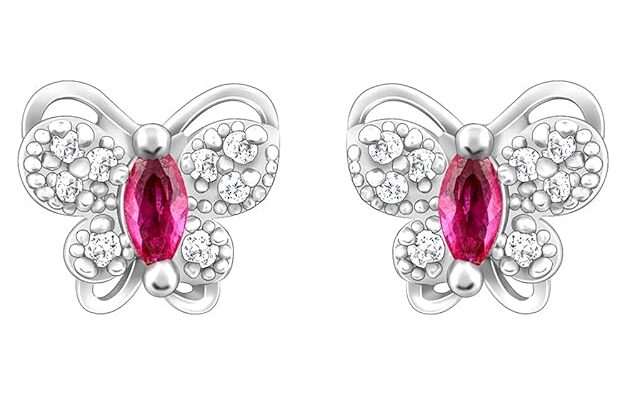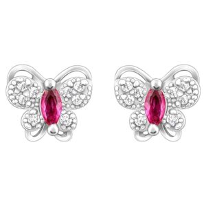 These silver studs feature a butterfly motif with a pink-coloured stone placed at the centre, and butterfly wings studded with zircons.